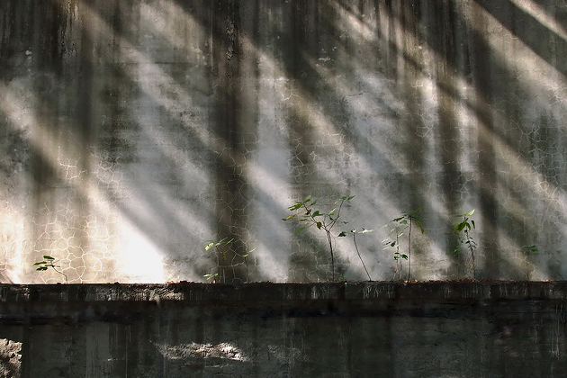 這是張非常難得的佳作,如果您被這張作品吸引,來自三個方面,第一是線條,展示面中同時存在直線、橫線與斜線,這三種線條均代表不同的心理影響,水平表寧靜,垂直表秩序,斜線表動感,更可貴的是畫面中這三種線條同時包含人為與自然的線條,這是最棒的呈現方式。第二是象徵生命力的小草,有高有低,另我聯想到不同時期的幼童,沐浴在光線下成長的隱喻。第三是來自背景與前景二種不同牆壁上的細節文理,這張作品不管怎麼看都是百分百的佳作! 而且這只是生活周遭的一景,並非名山大景,能夠拍出這樣的作品靠的是敏銳的觀察力。(怡妏作品)