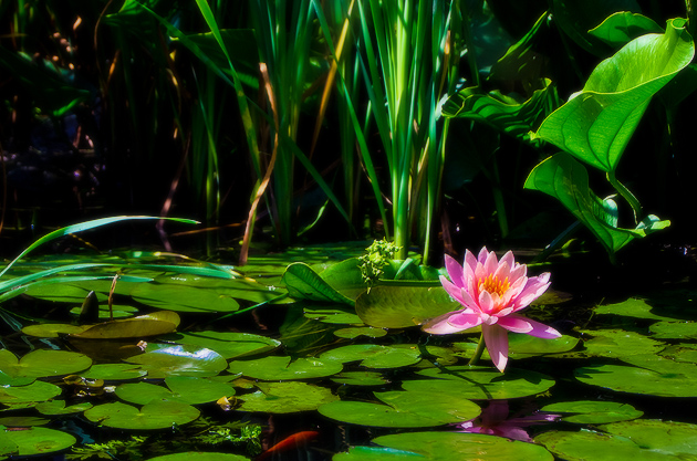 這張佳作令人目光難以離開右下方的蓮花,主要來自二個原因,其一是蓮花在整體畫面中屬於點綴色,在背景幾乎全為綠色的情況下,蓮花的點綴色輕易跳出畫面引人注目,其二是蓮花安排位置為視覺重點區的右下角位置,該位置容易吸引目光。整體畫面安排不僅構圖嚴謹亦十分討喜。(義彬作品)