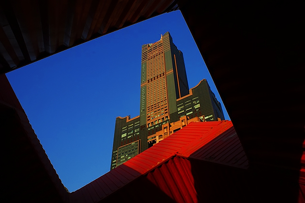 這張作品採用的是框景式構圖法,透過現場一個特別的紅色貨櫃擺設,巧妙地將八五大樓框了起來,框景中有顏色有細節也有剪影,而作品中營造的顏色對比,亦十分引人入勝,接近黃昏時刻的光線帶有一絲溫暖的黃調,整體而言是非常棒的一張作品! (Gino拍攝)