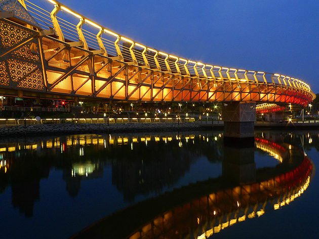 外拍主題是夜景,主要讓學生們親身體會在慢速快門下,色溫以及夜景的拍攝。愛河之心的特色在於:漂亮的橋身曲線、河面倒影,若能搭配太陽下山後的色溫,則拍出來的夜景會非常漂亮! 這張佳作正是充分將愛河之心的三大特色集於一身,並且橋身與橋影互為虛實相映的對比,真的很漂亮! (秀琦作品,DC拍攝)