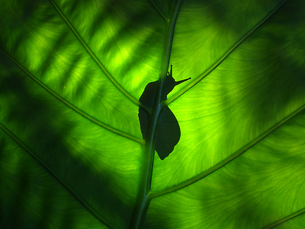 這張佳作具備非常強烈的視覺陌生感,透過逆光下的葉面呈現出蝸牛優美的剪影,葉上的線並有絕佳的視覺引導作用,將觀賞者的視覺立即性地引導至蝸牛剪影上,這張作品非常完美!