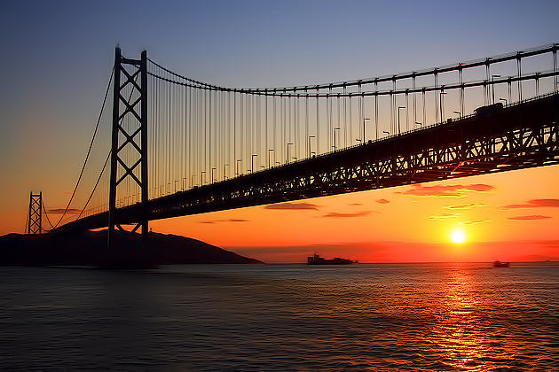 這張佳作採用包圍曝光方式拍攝,並取最滿意漂亮的一張,雖然深藍色溫即將蓋頂,然而橘紅色溫依然把最漂亮的顏色發光發熱到最後,配合壯闊的大橋與遠舟的剪影,不管怎麼看都是上乘佳作! (蕙琴作品)