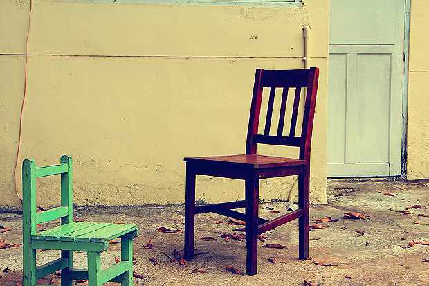 椅子具有高度的人文性,當畫面中出現二張椅子時,容易產生具有故事性的想像空間,或者擬人化,以這張作品為例,二張椅子一大一小,有擬人年紀大小的隱喻,而動線互視,又彷若二個人正在對話或相視,作者將畫面色調以低飽和度處理,以色彩增強人文性與時間的感受。(Becky作品)