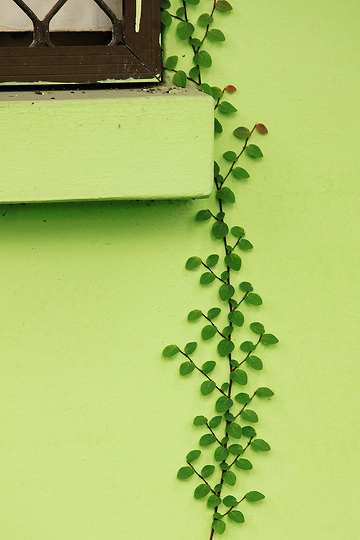 這張作品原作將爬牆虎至於畫面中線,由於封閉式線條置於中線容易因左右過度平穩而產生單調感,故經過二次構圖後,將爬牆虎改置於略靠右邊處,讓左右二邊面積比例大小有所區別,如此可獲得更生動的感受,本張佳作的對比性展現在顏色上,雖同屬綠色,然顏色深淺分別各為自然綠與人造綠,相當好的觀察,是本張佳作值得觀摩學習之處。(家怡作品)