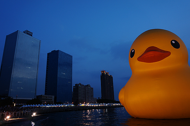 這幾個月來,黃色小鴨進駐高雄引起相當高度的回饗,許多攝影愛好者莫不前往取景,由於小鴨主體為黃色,嘴喙為紅色,因此若以色彩搭配以藍色背景尤佳,如此三原色不僅一應俱全,主題鮮明,彼此之間顏色面積分布控制得宜,一張作品如果能透過觀察後,進行好的色彩搭配,可明顯為作品提昇高度視覺力。(虹如作品)