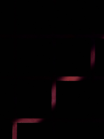 非常成功的幾何光影線條作品! 主體為紫色階梯狀的線條,而呈現這個線條的是一豎斜照的光,在有形與無形的線條中,成功地取得完美的搭配與對比,背景以全黑的方式,非常適合突顯這道斜光的明亮,若背景稍亮一些,就會影響這道斜光的作用。(俊傑作品)