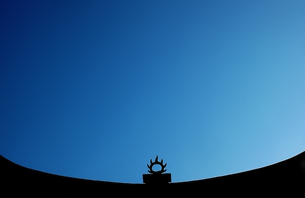 這張佳作以剪影的方式呈現,在大面積的藍色漸層色塊前,安排屋頂弧線以及太陽圖案在畫面中極具張力的位置,這張作品可強烈感受到黑色的力道,也因為剪影可將觀賞者的注意力集中在輪廓上,更有利於展現作者對於線條與形狀的純粹性安排。(怡妏作品)