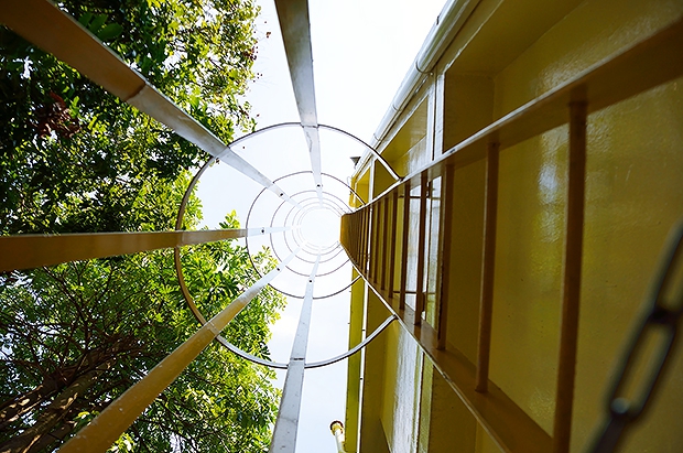 這是一張將幾何元素透過少見的仰看角度,形成高度視覺陌生感的佳作,多條直線往畫面中心集中,並且加上同心圓線條,視覺引導作用強烈,左邊綠葉以及黃綠雙色調為本張佳作帶來協調的感受。(啟助作品)