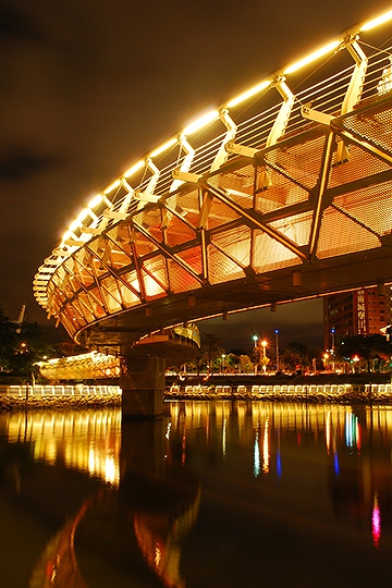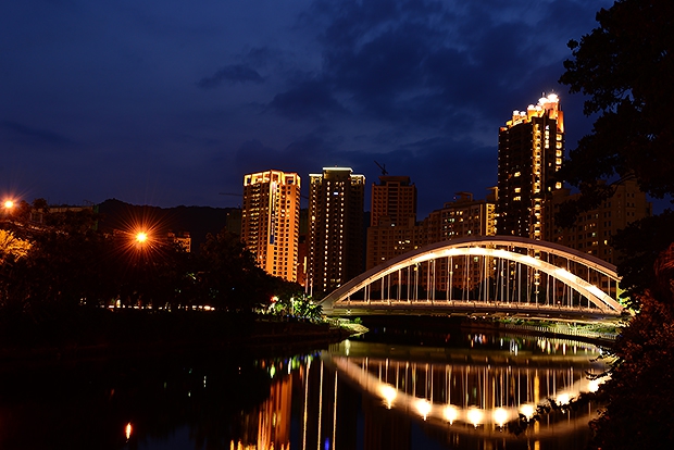這張愛河之心將水平線放在接近中線位置,主要目的是透過水平線展示天空色溫與水面倒影的雙重優勢,繼而展現橋身的特色,當快門速度更慢時,水面的一切將被撫平如鏡。(彥甫作品)