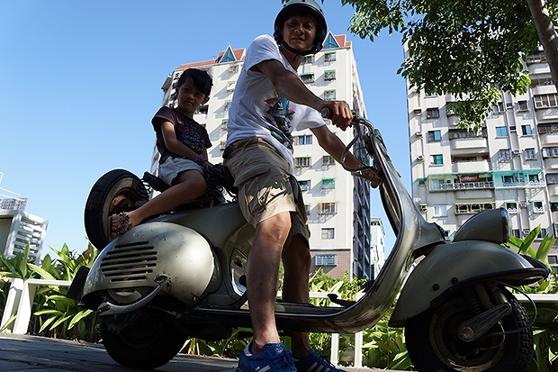 本張佳作採用超低角度展現一對父女騎著少見的偉士牌摩托車,創造視覺陌生感的方法除了主體本身的外觀特色外,採用特別的角度,例如超低角度,亦能展現陌生感。若覺人物臉上有過多的陰影,解決方法除了使用閃燈消除陰影外,亦可考慮使用數位重曝的方式處理。(定中作品)