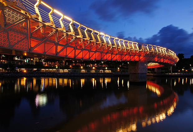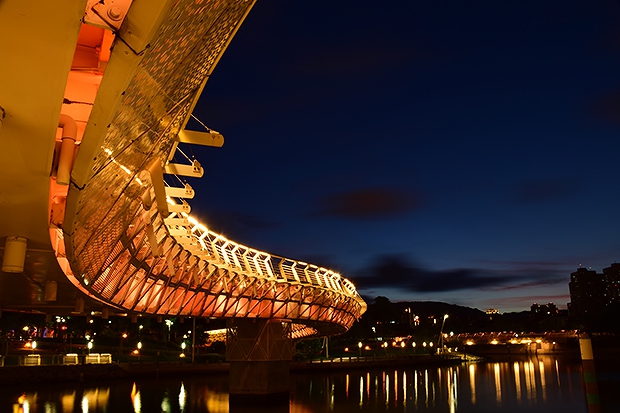 除了愛河之心外,願景橋亦是目前高雄當紅夜景拍攝地點之一,在正確的黃金時間下拍攝是最關鍵因素,天空色溫、遠方山巒輪廓、橋身弧線與倒影,一應俱全,非常漂亮!(舜添作品)
