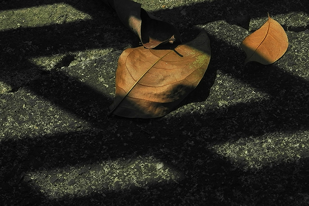 這張作品透過欄杆縫隙之間的光影,拍攝在光影之中的二片落葉,除了落葉的面積具有大小對比之外,落葉位置恰巧位於亮處窗隔間,能透過框景式構圖產生聚焦集中的效果。(麗珍作品)