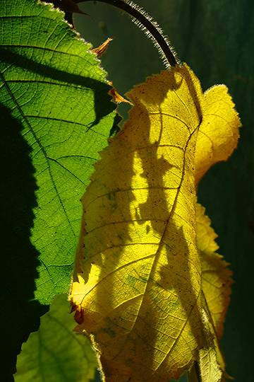 這張佳作的最大功臣為逆光的選擇,只有逆光才能創造出畫面中葉面透亮的顏色,以及投影輪廓。黃綠二色的交疊相當協調而舒服,並且顯示出二片葉子在生命型態上的對比,更難得的是黃綠葉的葉面的鋸齒狀邊緣,安排與畫面最左邊剪影輪廓的鋸齒狀呼應,足見細心巧思。(孟蓉作品)