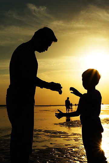 這是一張很棒的人文剪影作品,夕陽海邊,好似一對父子正在進行詩與授之間的動作,這個動作在人文攝影中屬於容易產生故事性的構圖方式,剪影的優勢在於展現輪廓,大幅增加本張作品故事性的力道,這張作品若改為以閃燈針對人物細節補光,則反不如剪影表現強烈。(安奕作品)