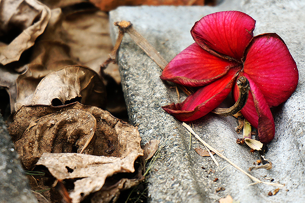 強烈的生命型態對比,畫面右邊是鮮紅的花朵,左邊則是已經生命消逝枯萎的枯葉,花葉本是唇齒相依,花謝葉枯之間,一道斜線,一道惆悵。(安奕作品)
