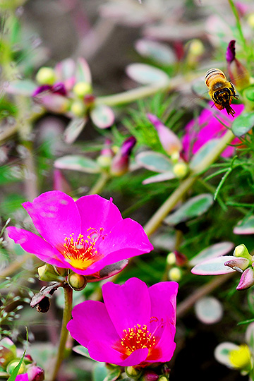 拍攝花卉時若希望昆蟲入鏡,務必守株待兔加上連拍,以數量換成功率,並且需使用高速快門方能凍結動作。本張原作涵蓋範圍較廣,經過二次構圖後改為直式,不僅更緊湊,也讓蜜蜂與花朵的面積更大,細節更多。(宏陽作品)