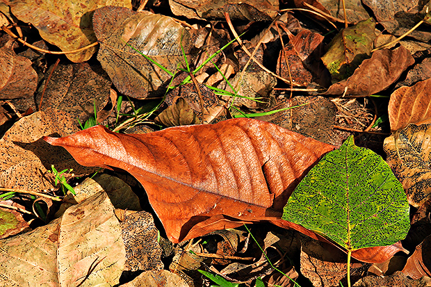 這張佳作呈現的是生命型態的對比,滿地的秋葉枯葉,滿地的蕭瑟,在大與小之間存在著對比,在枯萎與即將枯萎之間,亦存在著對比,對比與對比的對看之間,秋風吹來了這一年的寒意,吹走了曾是綠葉的青春。(文琪作品)