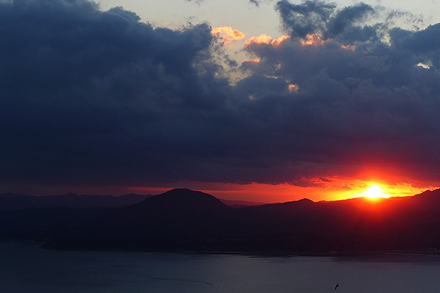 這張佳作夕陽放置的位置相當好,靠近高張力的臨界點,擺脫常見的黃金比例放置,濃厚多層次的雲層與山脈,將夕陽夾在一道細細窄窄的縫隙中,宣告夜幕舞台即將的到來。(盈嬅作品)