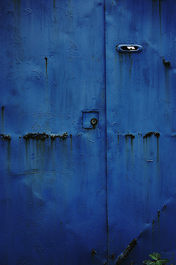 這張佳作採用雙色調構圖,大面積的深藍色,結合金屬鏽門,創造出冷調感,然而仔細一看在畫面的右下角,安排一處幼小稚嫩的綠葉作為點綴色,為整張作品帶來在堅硬嬌柔感受上的對比性,此外大面積的藍色因受鏽蝕影響而產生更多層次。(孟蓉作品)