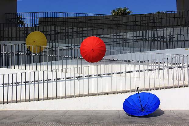 這張佳作同樣採用三原色進行創作,並搭配看似複雜,實則秩序的線條為背景,最後方的背景再利用藍色色塊與三原色相呼應,右下角翻落的藍傘,與其他二傘之間在型態上產生對比,是好的構思。(靜怡作品)