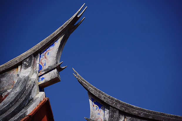 這張佳作同樣拍攝燕尾,但與上一張作品不同之處在於使用更望遠端展現二座燕尾的曲線與細節質感,並且將二座燕尾的相互曲線角度安排地非常具有美感及緊湊感,背景再搭配心曠神怡的深藍色塊,充分展現廟宇之美。(慧怡作品)
