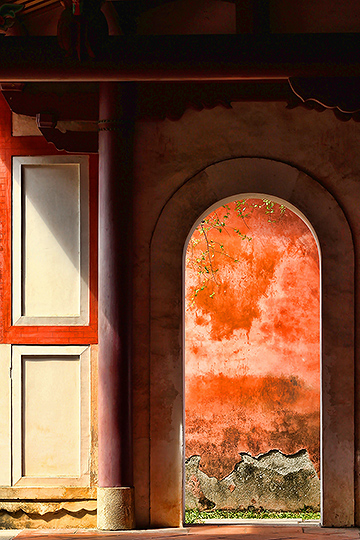 這張作品巧妙地利用圓柱將畫面分開成左右二邊,左邊由上下紅白二個矩型構成,並且上方紅色區矩型尚有一道斜線劃過,產生視覺力道與明暗分布,畫面右邊外明內暗,框景中產生圓拱形的紅色與細節質感,左右二邊安排面積按照黃金比例分配,相當傑出。(汶潔作品)