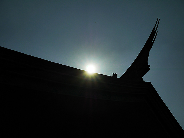 這張佳作採用大面積的黑色剪影來衝擊視覺,並且在廟宇線條交界處安排太陽耀光,剪影有利於展現輪廓優勢,以及使用黑色的重量感來加深印象。(濠丞作品)