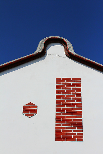 這張佳作相當精簡,僅保留線條與形狀,雖然使用馬背對稱構圖,但因透過六角形與長方形面積大小不同,在視覺重量上產生變化不致過度均衡,深藍色的天空與紅磚色,讓這張作品在顏色上形成雙色調,並且透過白牆調和雙色。(瓊英作品)