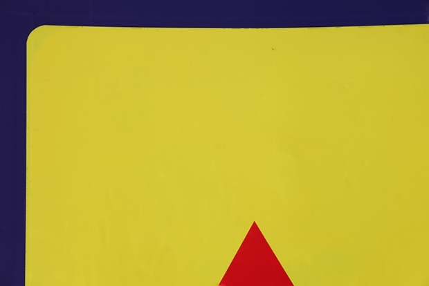 這張作品在紅黃藍三色調的安排間,仔細地安排了三種顏色各別的面積比例,醒目的紅色三角形放在畫面底線,使用黃藍一個面積,一個線條的二種直角與色塊,來襯托紅色三角,這張是相當好的顏色比例與形狀的安排之作。(舜添作品)