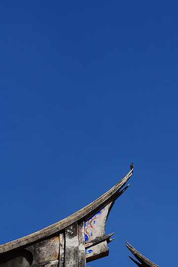 這張佳作僅針對燕尾的曲線拍攝,目的在展現屋脊的優美線條,以及背景漂亮的藍色色塊,令人有意外之喜的是在燕尾尖端停駐了一隻小鳥,為整張作品帶來相當好的點元素運用。(明玉作品)