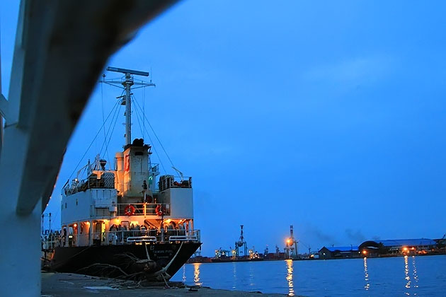 大船靜靜地停靠在傍晚的藍色色溫中,船上與岸邊的搖曳燈火是最好的點綴,這張作品構圖不俗,有令人耳目一新的感覺。(佩樺作品)