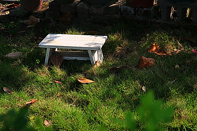 綠茵草地上的白色小椅子,很可愛,令我聯想到天真可愛的小朋友在草地上玩耍後累了再休息,這張作品將小白椅安排在視覺重點的第一優先位置,加上小白椅的外型與綠白之間的顏色搭配,都是強烈吸引觀賞者注意的因素。(佩玲作品)
