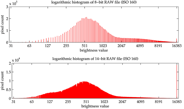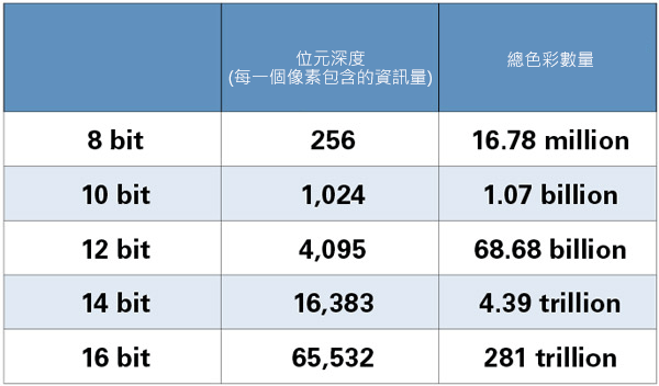 首先我們必須先知道一張照片是由無數個像素(Pixels)所構成,一個像素看起來像一個點,每一個像素所包含的資訊量稱之為位元深度(Bit depth)。若你機身選擇的是JPG檔,位元深度是8bit,每個點擁有2的8次方=256個層次,一張照片可以擁有(R)256* (G)256*(B)256=16,777,216(1,677萬)種顏色,看起來似乎相當豐富,然而跟raw檔的14bit比起來呢?若你機身選擇的是14bit RAW檔,那麼每個點擁有2的14次方=16,384個層次,是jpg檔的64倍,14bit RAW一共可表示出(R)16,384*(G)16,384*(B)16,384=4,398,046 ,511,104種顏色,請參閱下面幾個圖例我們會更清楚差異。