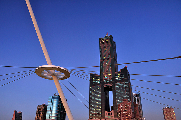 透過現場的橋身特色結構當做前景,與主體八五大樓相呼應,這張作品若可以將該裝置藝術的高度提高些,使之與八五大樓的視線空間相呼應,則整體會更佳。(凱貿拍攝)
