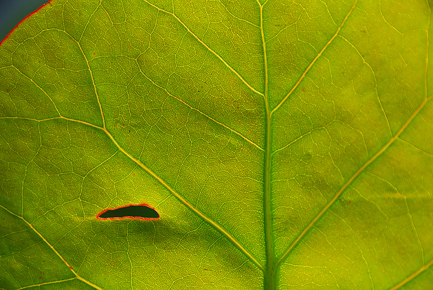 人的視覺心理是很微妙的,明明整張畫面幾乎充滿著綠葉,您的視覺重點卻集中在左下方的破洞,這張佳作成功地創造出可以影響視覺心理的條件,並且也提供賞心悅目的新綠主色,以及葉脈上鉅細靡遺的紋理細節,我個人非常喜歡這張作品。(雅惠作品)