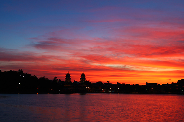 利用傍晚的戲劇性色溫及剪影構成這張佳作的主要元素,我們在上課中曾經提過,色溫攝影要拍得更上層樓,光是成功捕捉色溫還不夠,還必須有明確的拍攝主體,以及天空多層次的雲彩,例如這張佳作以蓮池潭為剪影方式拍攝,加上天空如毛筆劃過般的雲彩層次,是這張相片成功的關鍵要素。(元忠作品)