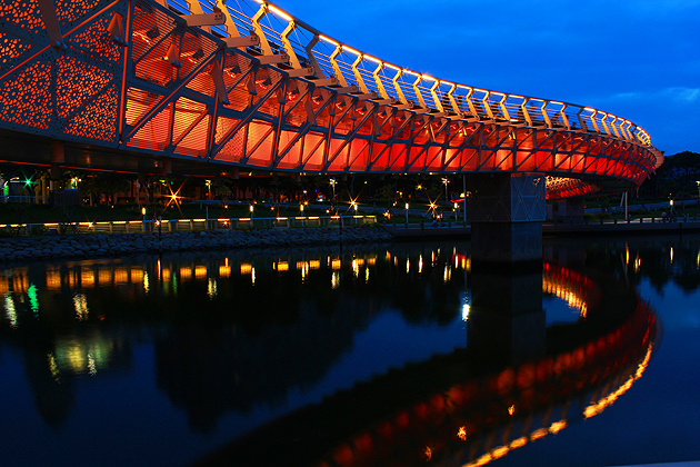 這張作品把大部分的面積留給曲橋主體,橋下倒影供觀賞者欣賞橋身曲顯,實體橋身供觀賞者欣賞重複三角形的幾何圖案,天空、水面的藍色色溫,與橋身的紅色,形成令人心曠神怡的顏色對比。(賢龍作品)