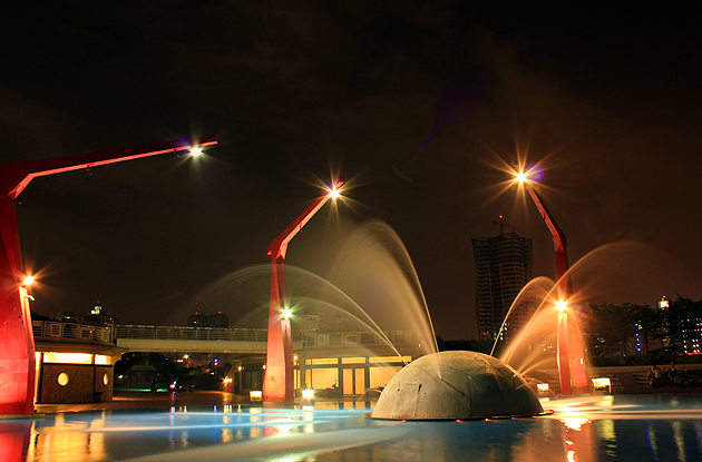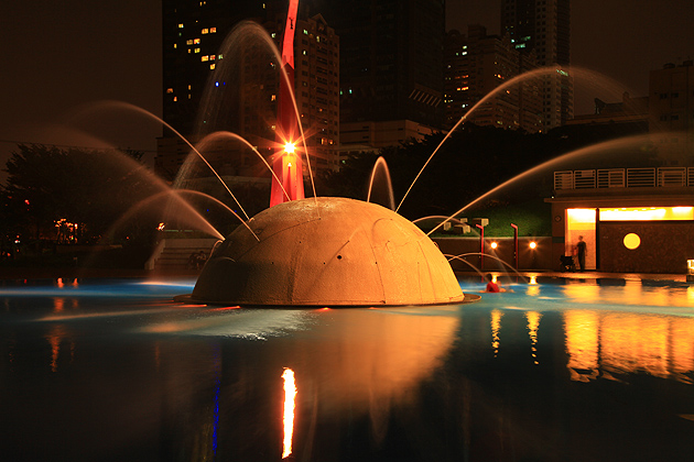 慢速快門下,水霧顯得格外討喜,水柱形成的曲線也很漂亮,半球體安排在右下方的視覺重點區,可非常立即性地引導視覺焦點。(馨瑩作品)