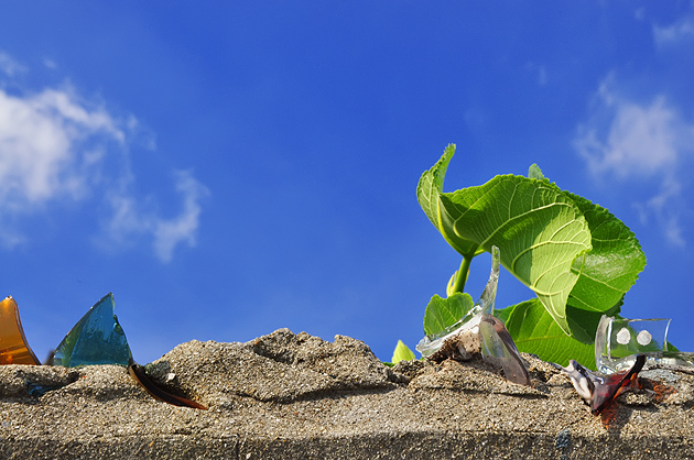 這張佳作由於將尖銳的玻璃入鏡,因此顯得有更強的視覺衝擊力,因為一般人對於尖銳鋒利的物體總是在淺意識中有種危險的感受,這張作品適當地擺放入一片緩和氣氛的葉子,恰到好處,構圖不俗。(東峰作品)