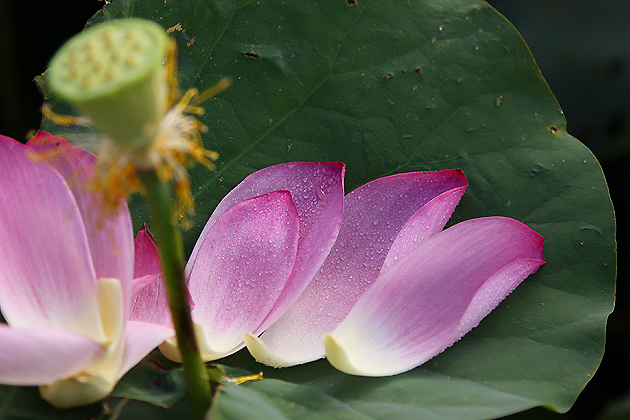 這張拍攝精心佈置過的荷瓣,攝影是減法也是加法,我在課堂上也鼓勵學員各種創作的嘗試,不要拘泥受限於攝影一定就是要怎樣才是王道,自然固美,人為亦好。花瓣上若要加上水珠,建議不要用噴水器,因為水珠大小與分佈太均勻,建議用手指沾水後揮灑,水珠會有大有小,分佈亦可較自然。(熾賢作品)