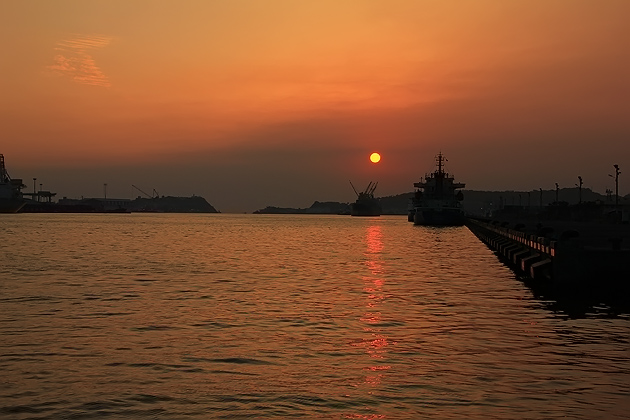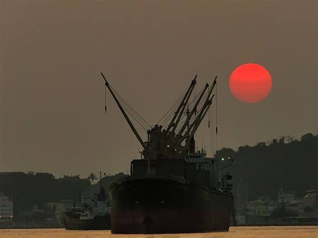 這張佳作的靈魂所在是夕陽即將隱入海平面之際下,那道拖曳在海面上的餘暉,非常迷人,遠處的港口與船隻都變成了陪襯的剪影。(芳玲作品)