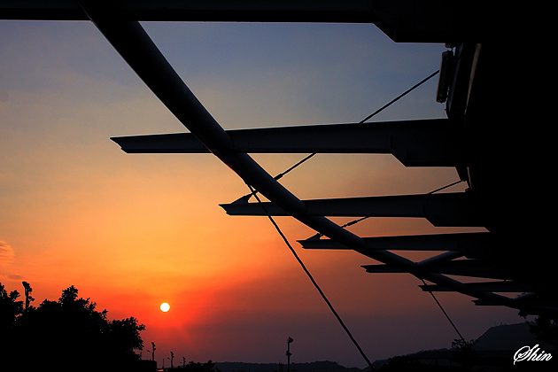 這張佳作的前景以鋼構橋及遠方樹叢的大面積剪影來衝擊視覺,背景則捕捉到不同色溫顏色的過度地帶,顏色層次非常豐富,夕陽則扮演畫龍點睛的角色,整體構圖緊湊不俗,很好的作品! (翊棨作品)