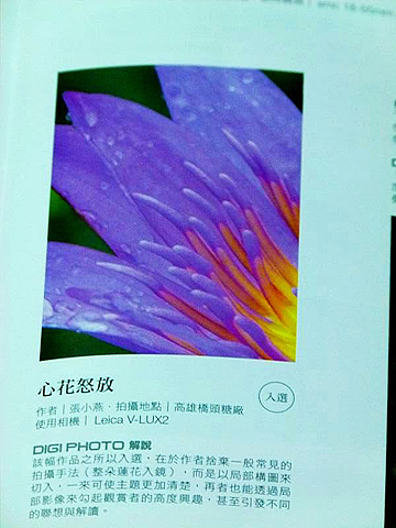 在這裡恭喜小燕受到DIGIPHOTO雜誌的評審肯定,也再次證明,即使是初學者,也不是拿頂級高檔單眼,只要學習方向正確,加上自己的一點努力,一樣可以在短時間獲得很棒的成就。