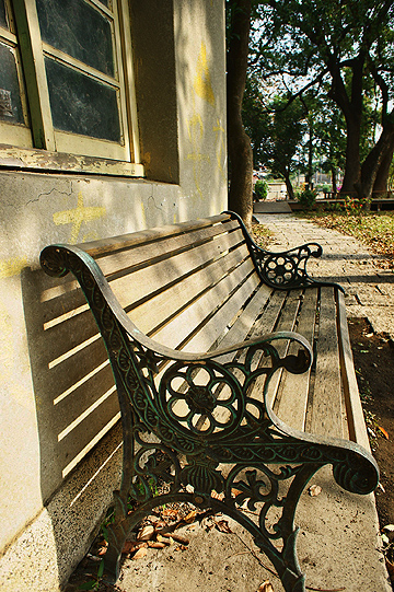 這張拍攝主體是張戶外椅子,並以廣角鏡較戲劇化的透視感呈現,如此可讓椅子看起來比實際體積還大,不過這張相片主要呈現的並非椅子本身,而是透射於椅子縫隙的光影,為了將光影對比拉開,用-EV的方式效果明顯,且也可將椅子本身顏色加深一些。(宥滋作品)