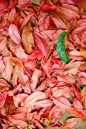 如果您跟我一樣也被這張作品深深吸引,來自於這張佳作具備三種對比,其一,綠葉與紅葉在顏色上的冷暖對比,其二,單一綠葉與多數量紅葉上的數量對比,其三,綠色象徵生命,枯紅暗喻消逝,然而這片綠葉再過一些時間,終將成為消逝的一份子,心裡對比。在作品中能呈現豐富的對比,就能具備更有深度的內涵。(志偉作品)