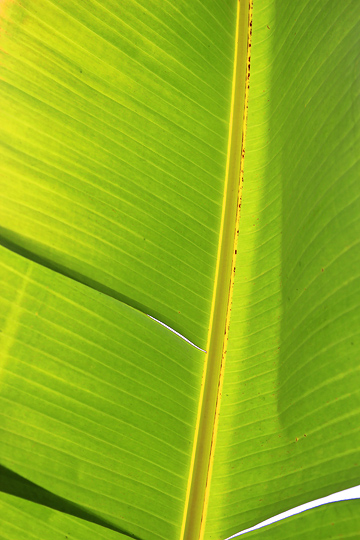 逆光下的一葉,顏色在光線的加持下遠比順光突出,綠色層次豐富,鉅細靡遺的葉脈紋理,極具可看性,最難得的是中間劃過整個畫面的線條,強而有力卻又避開中線的單調,實屬不易。(肇光作品)