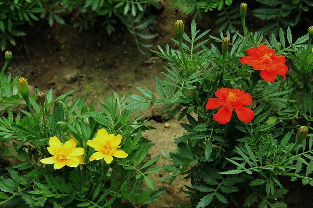 在完形心理學上,畫面中二朵並排的黃花或紅花,在觀賞者的心裡面均會被視為黃花與紅花的單一個體,而非二朵黃花與紅花,因此在這樣的情況下紅花為主黃花為副,並以原色互搭,主客依然分明,背景的綠葉則提供絕佳的陪襯背景,不僅在顏色上可與紅花互補,亦與黃花鄰近,是配色佳作。(興章作品)