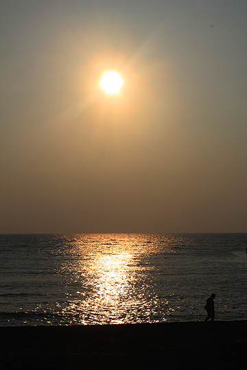 剪影容易以大面積的黑色衝擊視覺,此時必須以點測光測天空較亮區域,鎖定曝光值後重新構圖拍攝,由於天空並非均勻的亮,因此通常需要試拍幾張才能掌握最佳曝光值,右下角的人影為這張佳作帶來人文氛圍畫龍點睛的作用。(菽君作品)
