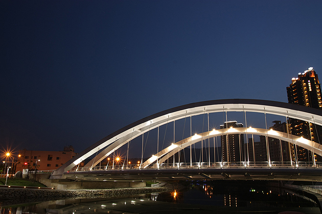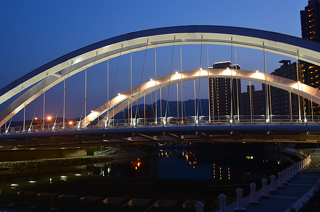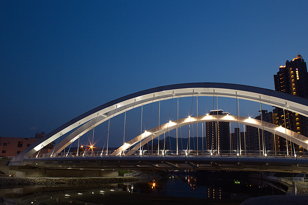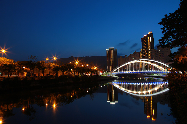 這張佳作可以稱得上願景橋的招牌畫面,只要時機正確、不錯的位置,以正確的夜拍技巧,就能拍攝出如相片中的美景,由於時機正確,因此天空呈現美麗的寶藍色,以及遠山與建築物的輪廓,搭配二岸燈影、橋身與倒影,非常美麗! (文貴作品)