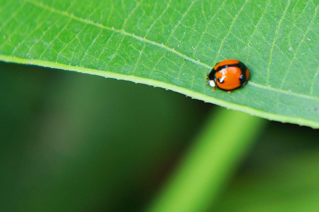 在花卉植物的攝影上,將昆蟲安排入鏡有畫龍點睛之效,不同的昆蟲具備不同的心理感受,例如蜜蜂象徵活潑,蝴蝶優雅,瓢蟲逗趣可愛,毛毛蟲容易令人頭皮發麻等。這張佳作安排瓢蟲入鏡,增添一份逗趣可愛的感受,並且瓢蟲的顏色與綠葉互成顏色對比,經過把過多不必要的背景裁切後,構圖更緊湊了。(奕曈作品)
